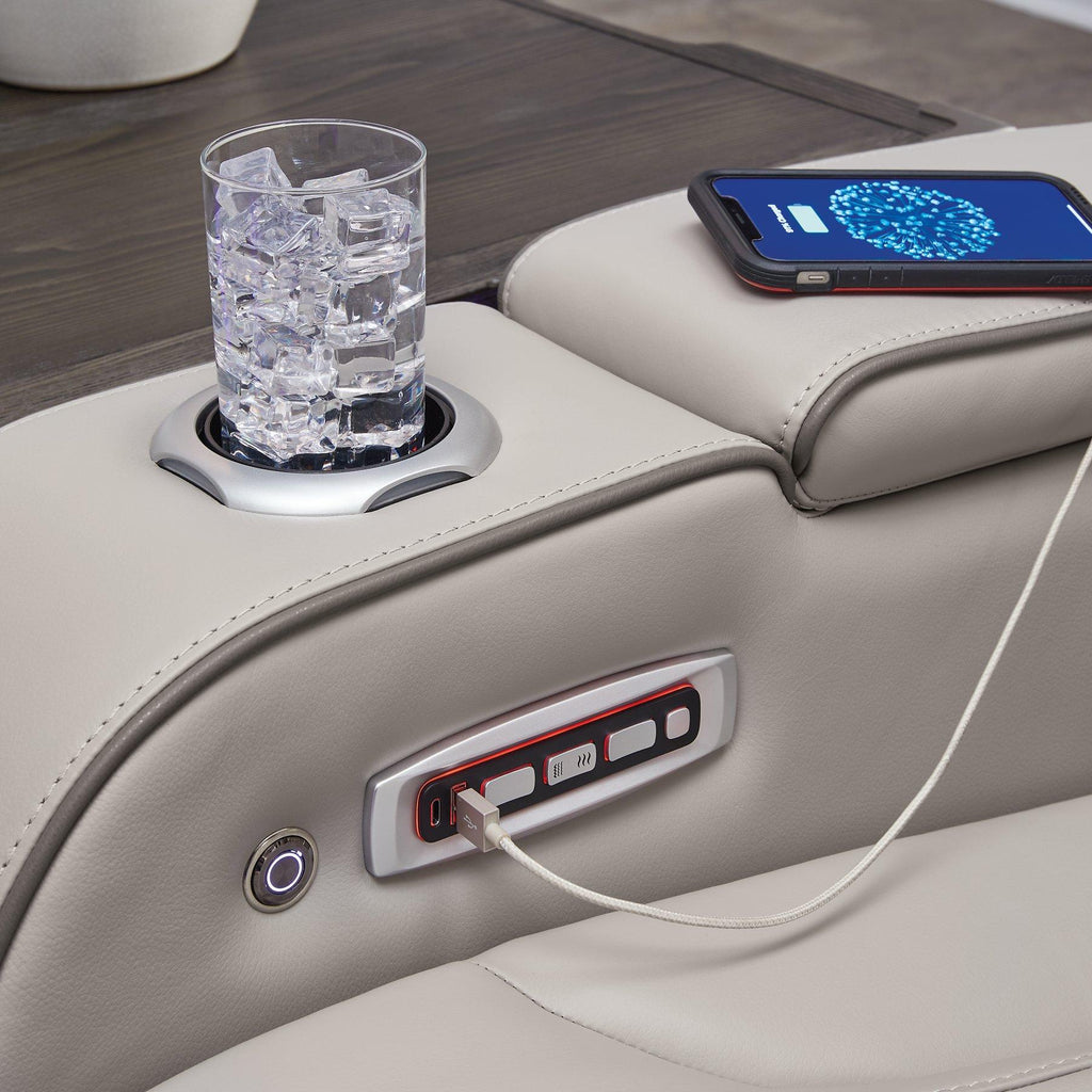 - Drop-down table with LED reading lights, dual cup holders and wireless charging; power cord included; UL Listed
